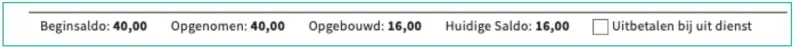 In dit voorbeeld (januari) bouwt de medewerker 16 verlof uren per maand op, wat neer komt op 24 vakantiedagen per jaar. Elke maand zal er dus 16 uur bij dit saldo opgeteld worden.